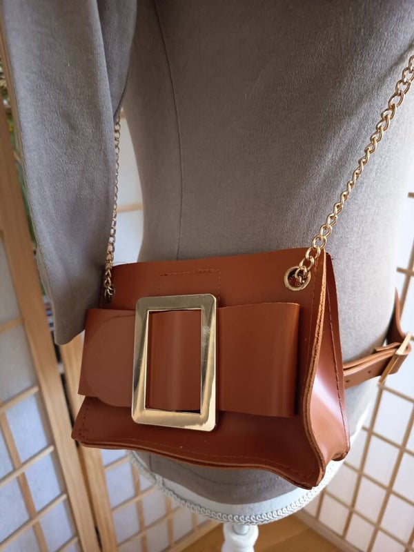 Umwandeln von der Umhängetasche zu Gürteltasche und nach Bedarf zu Tragetasche. Die Umhänge Kette ist kurz oder länger zu tragen. Mittig befindet sich eine Schnalle in Gold.