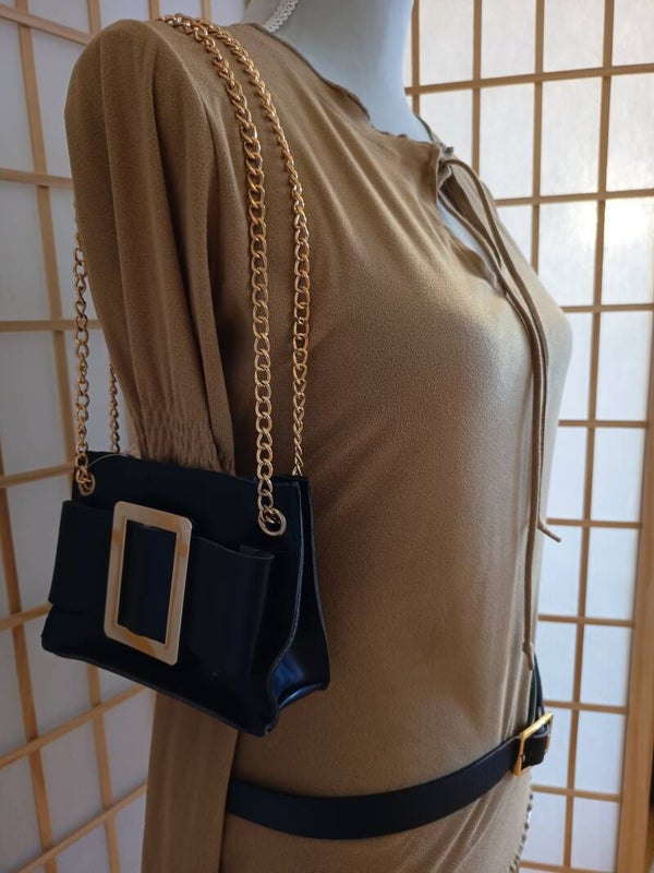 Umwandeln von der Umhängetasche zu Gürteltasche und nach Bedarf zu Tragetasche. Die Umhänge Kette ist kurz oder länger zu tragen. Mittig befindet sich eine Schnalle in Gold.