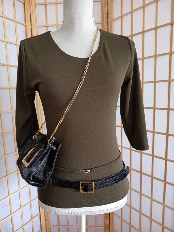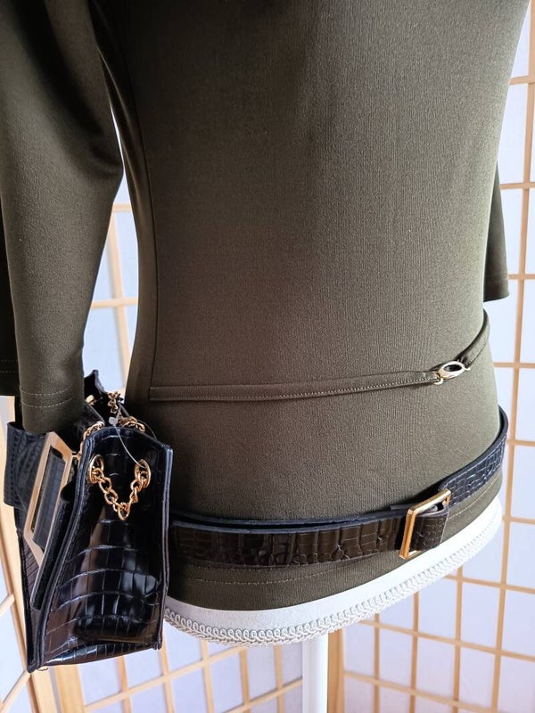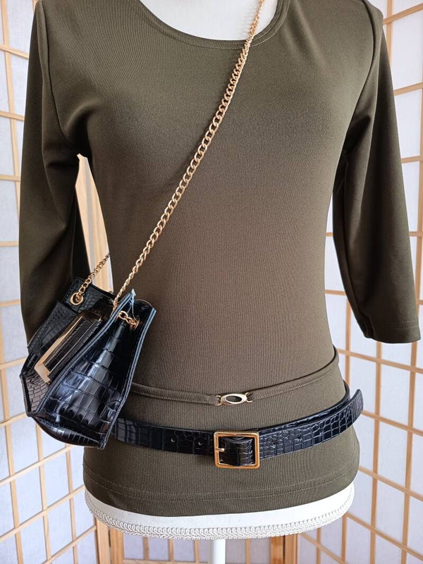 Umwandeln von der Umhängetasche zu Gürteltasche und nach Bedarf zu Tragetasche. Die Umhänge Kette ist kurz oder länger zu tragen. Mittig befindet sich eine Schnalle in Gold.