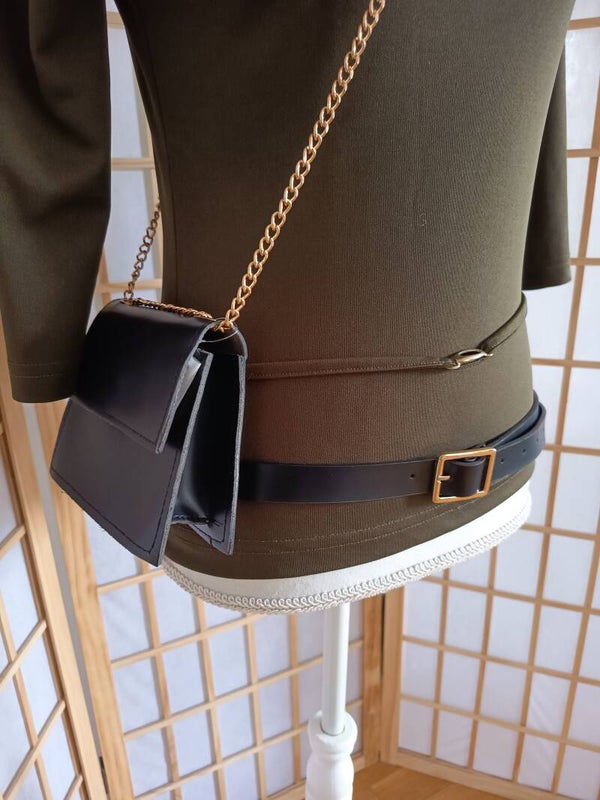 In kleinen Schritten wird das Umwandeln von der Umhängetasche zu Gürteltasche und nach Bedarf zu Tragetasche. Die Umhänge Kette ist kurz zum Tragen oder länger über die Schulter tragbar.